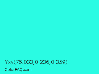 Yxy 75.033,0.236,0.359 Color is a normal cyan color and the nearest color is Loeen #15f2fd. Hex code #2afbe3 and RGB value is rgb(42,251,227). In RGB color space, this color is composed of 16% red, 98% green, 89% blue, In CMYK color space, this color is composed of 83% cyan, 0% magenta, 10% yellow , 2% black , In HSL color space, this color has a hue angle of 173° , 96% saturation and 57% lightness.
