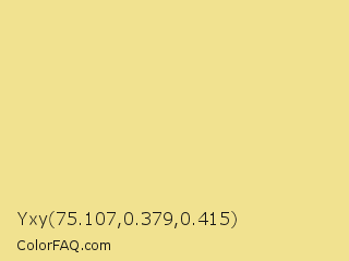 Yxy 75.107,0.379,0.415 Color is a light yellow color and the nearest color is Wild Rice #ece090. Hex code #f1e290 and RGB value is rgb(241,226,144). In RGB color space, this color is composed of 95% red, 89% green, 56% blue, In CMYK color space, this color is composed of 0% cyan, 6% magenta, 40% yellow , 5% black , In HSL color space, this color has a hue angle of 51° , 78% saturation and 75% lightness.