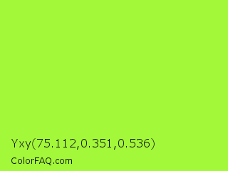 Yxy 75.112,0.351,0.536 Color is a normal green color and the nearest color is French Lime #9efd38. Hex code #a2f839 and RGB value is rgb(162,248,57). In RGB color space, this color is composed of 64% red, 97% green, 22% blue, In CMYK color space, this color is composed of 35% cyan, 0% magenta, 77% yellow , 3% black , In HSL color space, this color has a hue angle of 87° , 93% saturation and 60% lightness.