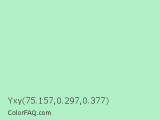 Yxy 75.157,0.297,0.377 Color is a very light green color and the nearest color is Madang #b7f0be. Hex code #b1efc6 and RGB value is rgb(177,239,198). In RGB color space, this color is composed of 69% red, 94% green, 78% blue, In CMYK color space, this color is composed of 26% cyan, 0% magenta, 17% yellow , 6% black , In HSL color space, this color has a hue angle of 140° , 66% saturation and 82% lightness.