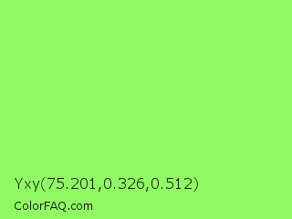 Yxy 75.201,0.326,0.512 Color is a light green color and the nearest color is Inchworm #b2ec5d. Hex code #90fa63 and RGB value is rgb(144,250,99). In RGB color space, this color is composed of 56% red, 98% green, 39% blue, In CMYK color space, this color is composed of 42% cyan, 0% magenta, 60% yellow , 2% black , In HSL color space, this color has a hue angle of 102° , 94% saturation and 68% lightness.