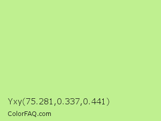 Yxy 75.281,0.337,0.441 Color is a light green color and the nearest color is Sulu #c1f07c. Hex code #bff090 and RGB value is rgb(191,240,144). In RGB color space, this color is composed of 75% red, 94% green, 56% blue, In CMYK color space, this color is composed of 20% cyan, 0% magenta, 40% yellow , 6% black , In HSL color space, this color has a hue angle of 91° , 76% saturation and 75% lightness.
