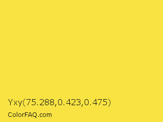 Yxy 75.288,0.423,0.475 Color is a light yellow color and the nearest color is Gargoyle Gas #ffdf46. Hex code #f8e342 and RGB value is rgb(248,227,66). In RGB color space, this color is composed of 97% red, 89% green, 26% blue, In CMYK color space, this color is composed of 0% cyan, 8% magenta, 73% yellow , 3% black , In HSL color space, this color has a hue angle of 53° , 93% saturation and 62% lightness.