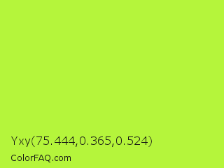 Yxy 75.444,0.365,0.524 Color is a normal green color and the nearest color is Green Lizard #a7f432. Hex code #b5f53b and RGB value is rgb(181,245,59). In RGB color space, this color is composed of 71% red, 96% green, 23% blue, In CMYK color space, this color is composed of 26% cyan, 0% magenta, 76% yellow , 4% black , In HSL color space, this color has a hue angle of 81° , 90% saturation and 60% lightness.