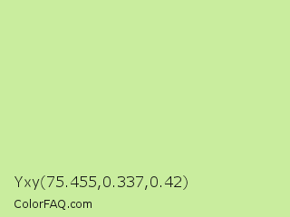 Yxy 75.455,0.337,0.42 Color is a light green color and the nearest color is Reef #c9ffa2. Hex code #c9ed9e and RGB value is rgb(201,237,158). In RGB color space, this color is composed of 79% red, 93% green, 62% blue, In CMYK color space, this color is composed of 15% cyan, 0% magenta, 33% yellow , 7% black , In HSL color space, this color has a hue angle of 87° , 69% saturation and 77% lightness.