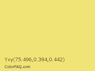 Yxy 75.496,0.394,0.442 Color is a light yellow color and the nearest color is Golden Sand #f0db7d. Hex code #f1e476 and RGB value is rgb(241,228,118). In RGB color space, this color is composed of 95% red, 89% green, 46% blue, In CMYK color space, this color is composed of 0% cyan, 5% magenta, 51% yellow , 5% black , In HSL color space, this color has a hue angle of 54° , 81% saturation and 70% lightness.