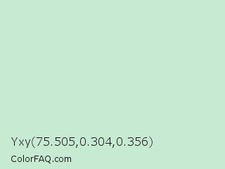 Yxy 75.505,0.304,0.356 Color is a very light green color and the nearest color is Edgewater #c8e3d7. Hex code #c7ead2 and RGB value is rgb(199,234,210). In RGB color space, this color is composed of 78% red, 92% green, 82% blue, In CMYK color space, this color is composed of 15% cyan, 0% magenta, 10% yellow , 8% black , In HSL color space, this color has a hue angle of 139° , 45% saturation and 85% lightness.