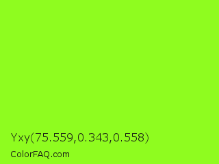 Yxy 75.559,0.343,0.558 Color is a normal green color and the nearest color is Spring Frost #87ff2a. Hex code #8ffc1f and RGB value is rgb(143,252,31). In RGB color space, this color is composed of 56% red, 99% green, 12% blue, In CMYK color space, this color is composed of 43% cyan, 0% magenta, 88% yellow , 1% black , In HSL color space, this color has a hue angle of 90° , 97% saturation and 55% lightness.