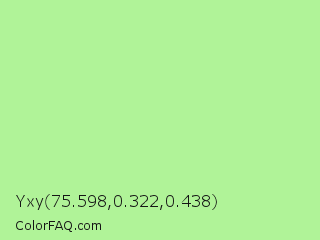 Yxy 75.598,0.322,0.438 Color is a light green color and the nearest color is Granny Smith Apple #a8e4a0. Hex code #b0f398 and RGB value is rgb(176,243,152). In RGB color space, this color is composed of 69% red, 95% green, 60% blue, In CMYK color space, this color is composed of 28% cyan, 0% magenta, 37% yellow , 5% black , In HSL color space, this color has a hue angle of 104° , 79% saturation and 77% lightness.