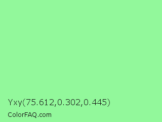 Yxy 75.612,0.302,0.445 Color is a light green color and the nearest color is Pale Green #98fb98. Hex code #92f89b and RGB value is rgb(146,248,155). In RGB color space, this color is composed of 57% red, 97% green, 61% blue, In CMYK color space, this color is composed of 41% cyan, 0% magenta, 38% yellow , 3% black , In HSL color space, this color has a hue angle of 125° , 88% saturation and 77% lightness.