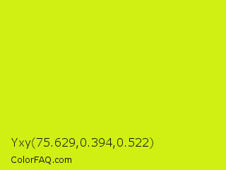 Yxy 75.629,0.394,0.522 Color is a normal yellow color and the nearest color is Las Palmas #c6e610. Hex code #cff012 and RGB value is rgb(207,240,18). In RGB color space, this color is composed of 81% red, 94% green, 7% blue, In CMYK color space, this color is composed of 14% cyan, 0% magenta, 93% yellow , 6% black , In HSL color space, this color has a hue angle of 69° , 88% saturation and 51% lightness.