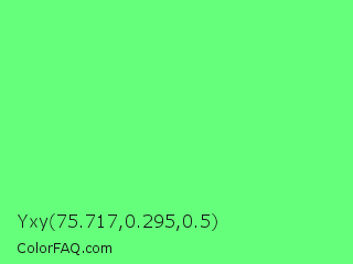 Yxy 75.717,0.295,0.5 Color is a light green color and the nearest color is Screamin Green #66ff66. Hex code #65ff7b and RGB value is rgb(101,255,123). In RGB color space, this color is composed of 40% red, 100% green, 48% blue, In CMYK color space, this color is composed of 60% cyan, 0% magenta, 52% yellow , 0% black , In HSL color space, this color has a hue angle of 129° , 100% saturation and 70% lightness.