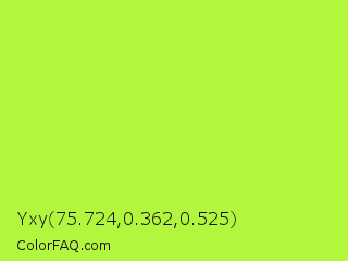 Yxy 75.724,0.362,0.525 Color is a normal green color and the nearest color is Green Lizard #a7f432. Hex code #b2f63d and RGB value is rgb(178,246,61). In RGB color space, this color is composed of 70% red, 96% green, 24% blue, In CMYK color space, this color is composed of 28% cyan, 0% magenta, 75% yellow , 4% black , In HSL color space, this color has a hue angle of 82° , 91% saturation and 60% lightness.