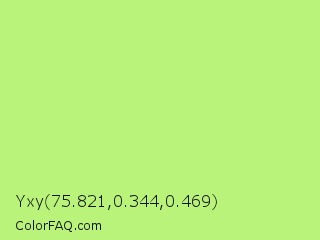 Yxy 75.821,0.344,0.469 Color is a light green color and the nearest color is Sulu #c1f07c. Hex code #b9f37a and RGB value is rgb(185,243,122). In RGB color space, this color is composed of 73% red, 95% green, 48% blue, In CMYK color space, this color is composed of 24% cyan, 0% magenta, 50% yellow , 5% black , In HSL color space, this color has a hue angle of 89° , 83% saturation and 72% lightness.