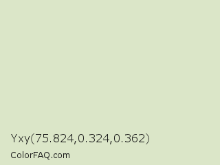 Yxy 75.824,0.324,0.362 Color is a very light green color and the nearest color is Beryl Green #dee5c0. Hex code #dbe6c8 and RGB value is rgb(219,230,200). In RGB color space, this color is composed of 86% red, 90% green, 78% blue, In CMYK color space, this color is composed of 5% cyan, 0% magenta, 13% yellow , 10% black , In HSL color space, this color has a hue angle of 82° , 38% saturation and 84% lightness.