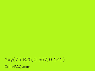 Yxy 75.826,0.367,0.541 Color is a normal lime color and the nearest color is Inch Worm #b0e313. Hex code #b1f71a and RGB value is rgb(177,247,26). In RGB color space, this color is composed of 69% red, 97% green, 10% blue, In CMYK color space, this color is composed of 28% cyan, 0% magenta, 89% yellow , 3% black , In HSL color space, this color has a hue angle of 79° , 93% saturation and 54% lightness.