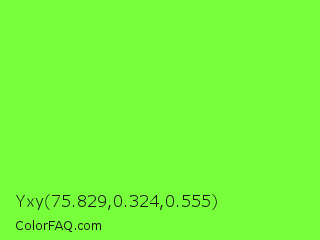 Yxy 75.829,0.324,0.555 Color is a light green color and the nearest color is Spring Frost #87ff2a. Hex code #78ff3c and RGB value is rgb(120,255,60). In RGB color space, this color is composed of 47% red, 100% green, 24% blue, In CMYK color space, this color is composed of 53% cyan, 0% magenta, 76% yellow , 0% black , In HSL color space, this color has a hue angle of 102° , 100% saturation and 62% lightness.