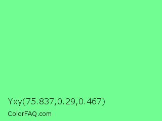 Yxy 75.837,0.29,0.467 Color is a light green color and the nearest color is Very Light Malachite Green #64e986. Hex code #71fd92 and RGB value is rgb(113,253,146). In RGB color space, this color is composed of 44% red, 99% green, 57% blue, In CMYK color space, this color is composed of 55% cyan, 0% magenta, 42% yellow , 1% black , In HSL color space, this color has a hue angle of 134° , 97% saturation and 72% lightness.