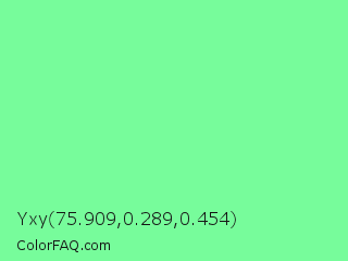 Yxy 75.909,0.289,0.454 Color is a light green color and the nearest color is Light Green #90ee90. Hex code #77fc9b and RGB value is rgb(119,252,155). In RGB color space, this color is composed of 47% red, 99% green, 61% blue, In CMYK color space, this color is composed of 53% cyan, 0% magenta, 38% yellow , 1% black , In HSL color space, this color has a hue angle of 136° , 96% saturation and 73% lightness.