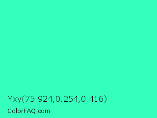 Yxy 75.924,0.254,0.416 Color is a normal green color and the nearest color is Turquoise #40e0d0. Hex code #34ffbd and RGB value is rgb(52,255,189). In RGB color space, this color is composed of 20% red, 100% green, 74% blue, In CMYK color space, this color is composed of 80% cyan, 0% magenta, 26% yellow , 0% black , In HSL color space, this color has a hue angle of 160° , 100% saturation and 60% lightness.