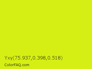 Yxy 75.937,0.398,0.518 Color is a normal yellow color and the nearest color is Arctic Lime #d0ff14. Hex code #d5ef15 and RGB value is rgb(213,239,21). In RGB color space, this color is composed of 84% red, 94% green, 8% blue, In CMYK color space, this color is composed of 11% cyan, 0% magenta, 91% yellow , 6% black , In HSL color space, this color has a hue angle of 67° , 87% saturation and 51% lightness.