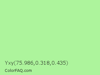 Yxy 75.986,0.318,0.435 Color is a light green color and the nearest color is Granny Smith Apple #a8e4a0. Hex code #adf49c and RGB value is rgb(173,244,156). In RGB color space, this color is composed of 68% red, 96% green, 61% blue, In CMYK color space, this color is composed of 29% cyan, 0% magenta, 36% yellow , 4% black , In HSL color space, this color has a hue angle of 108° , 80% saturation and 78% lightness.