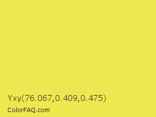 Yxy 76.067,0.409,0.475 Color is a light yellow color and the nearest color is Minion Yellow #f5e050. Hex code #efe74f and RGB value is rgb(239,231,79). In RGB color space, this color is composed of 94% red, 91% green, 31% blue, In CMYK color space, this color is composed of 0% cyan, 3% magenta, 67% yellow , 6% black , In HSL color space, this color has a hue angle of 57° , 83% saturation and 62% lightness.