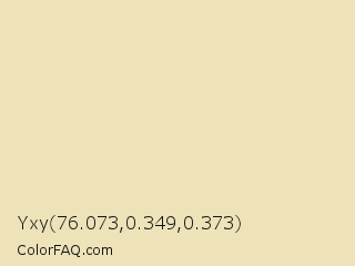 Yxy 76.073,0.349,0.373 Color is a very light yellow color and the nearest color is Dutch White #efdfbb. Hex code #eee2b9 and RGB value is rgb(238,226,185). In RGB color space, this color is composed of 93% red, 89% green, 73% blue, In CMYK color space, this color is composed of 0% cyan, 5% magenta, 22% yellow , 7% black , In HSL color space, this color has a hue angle of 46° , 61% saturation and 83% lightness.