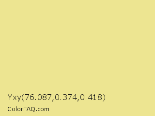 Yxy 76.087,0.374,0.418 Color is a light yellow color and the nearest color is Wild Rice #ece090. Hex code #ede591 and RGB value is rgb(237,229,145). In RGB color space, this color is composed of 93% red, 90% green, 57% blue, In CMYK color space, this color is composed of 0% cyan, 3% magenta, 39% yellow , 7% black , In HSL color space, this color has a hue angle of 55° , 72% saturation and 75% lightness.
