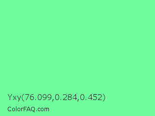 Yxy 76.099,0.284,0.452 Color is a light green color and the nearest color is Very Light Malachite Green #64e986. Hex code #6ffd9e and RGB value is rgb(111,253,158). In RGB color space, this color is composed of 44% red, 99% green, 62% blue, In CMYK color space, this color is composed of 56% cyan, 0% magenta, 38% yellow , 1% black , In HSL color space, this color has a hue angle of 140° , 97% saturation and 71% lightness.