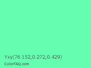 Yxy 76.152,0.272,0.429 Color is a light green color and the nearest color is Medium Aquamarine #66ddaa. Hex code #65fdb0 and RGB value is rgb(101,253,176). In RGB color space, this color is composed of 40% red, 99% green, 69% blue, In CMYK color space, this color is composed of 60% cyan, 0% magenta, 30% yellow , 1% black , In HSL color space, this color has a hue angle of 150° , 97% saturation and 69% lightness.