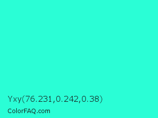 Yxy 76.231,0.242,0.38 Color is a normal cyan color and the nearest color is Turquoise #40e0d0. Hex code #2afed6 and RGB value is rgb(42,254,214). In RGB color space, this color is composed of 16% red, 100% green, 84% blue, In CMYK color space, this color is composed of 83% cyan, 0% magenta, 16% yellow , 0% black , In HSL color space, this color has a hue angle of 169° , 99% saturation and 58% lightness.