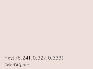 Yxy 76.241,0.327,0.333 Color is a very light red color and the nearest color is Bizarre #eededa. Hex code #efdfdb and RGB value is rgb(239,223,219). In RGB color space, this color is composed of 94% red, 87% green, 86% blue, In CMYK color space, this color is composed of 0% cyan, 7% magenta, 8% yellow , 6% black , In HSL color space, this color has a hue angle of 12° , 38% saturation and 90% lightness.