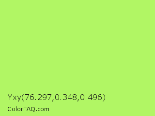 Yxy 76.297,0.348,0.496 Color is a light green color and the nearest color is Inchworm #b2ec5d. Hex code #b1f664 and RGB value is rgb(177,246,100). In RGB color space, this color is composed of 69% red, 96% green, 39% blue, In CMYK color space, this color is composed of 28% cyan, 0% magenta, 59% yellow , 4% black , In HSL color space, this color has a hue angle of 88° , 89% saturation and 68% lightness.