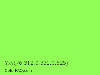 Yxy 76.312,0.331,0.525 Color is a light green color and the nearest color is Kiwi #8ee53f. Hex code #91fc56 and RGB value is rgb(145,252,86). In RGB color space, this color is composed of 57% red, 99% green, 34% blue, In CMYK color space, this color is composed of 42% cyan, 0% magenta, 66% yellow , 1% black , In HSL color space, this color has a hue angle of 99° , 97% saturation and 66% lightness.