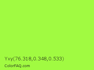Yxy 76.318,0.348,0.533 Color is a light green color and the nearest color is French Lime #9efd38. Hex code #a1fa41 and RGB value is rgb(161,250,65). In RGB color space, this color is composed of 63% red, 98% green, 25% blue, In CMYK color space, this color is composed of 36% cyan, 0% magenta, 74% yellow , 2% black , In HSL color space, this color has a hue angle of 89° , 95% saturation and 62% lightness.