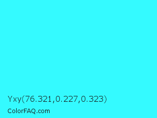 Yxy 76.321,0.227,0.323 Color is a normal cyan color and the nearest color is Loeen #15f2fd. Hex code #34faff and RGB value is rgb(52,250,255). In RGB color space, this color is composed of 20% red, 98% green, 100% blue, In CMYK color space, this color is composed of 80% cyan, 2% magenta, 0% yellow , 0% black , In HSL color space, this color has a hue angle of 181° , 100% saturation and 60% lightness.