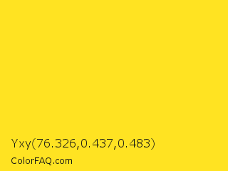 Yxy 76.326,0.437,0.483 Color is a normal yellow color and the nearest color is Candlelight #fcd917. Hex code #ffe322 and RGB value is rgb(255,227,34). In RGB color space, this color is composed of 100% red, 89% green, 13% blue, In CMYK color space, this color is composed of 0% cyan, 11% magenta, 87% yellow , 0% black , In HSL color space, this color has a hue angle of 52° , 100% saturation and 57% lightness.