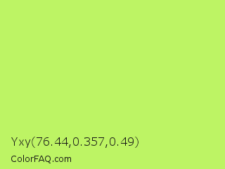 Yxy 76.44,0.357,0.49 Color is a light green color and the nearest color is Inchworm #b2ec5d. Hex code #bdf464 and RGB value is rgb(189,244,100). In RGB color space, this color is composed of 74% red, 96% green, 39% blue, In CMYK color space, this color is composed of 23% cyan, 0% magenta, 59% yellow , 4% black , In HSL color space, this color has a hue angle of 83° , 87% saturation and 67% lightness.