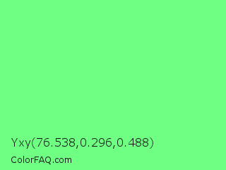Yxy 76.538,0.296,0.488 Color is a light green color and the nearest color is Very Light Malachite Green #64e986. Hex code #6fff83 and RGB value is rgb(111,255,131). In RGB color space, this color is composed of 44% red, 100% green, 51% blue, In CMYK color space, this color is composed of 56% cyan, 0% magenta, 49% yellow , 0% black , In HSL color space, this color has a hue angle of 128° , 100% saturation and 72% lightness.