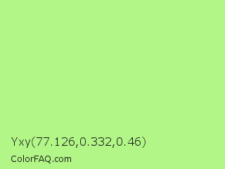 Yxy 77.126,0.332,0.46 Color is a light green color and the nearest color is Sulu #c1f07c. Hex code #b2f687 and RGB value is rgb(178,246,135). In RGB color space, this color is composed of 70% red, 96% green, 53% blue, In CMYK color space, this color is composed of 28% cyan, 0% magenta, 45% yellow , 4% black , In HSL color space, this color has a hue angle of 97° , 86% saturation and 75% lightness.