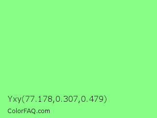 Yxy 77.178,0.307,0.479 Color is a light green color and the nearest color is Light Green #90ee90. Hex code #88fd85 and RGB value is rgb(136,253,133). In RGB color space, this color is composed of 53% red, 99% green, 52% blue, In CMYK color space, this color is composed of 46% cyan, 0% magenta, 47% yellow , 1% black , In HSL color space, this color has a hue angle of 119° , 97% saturation and 76% lightness.