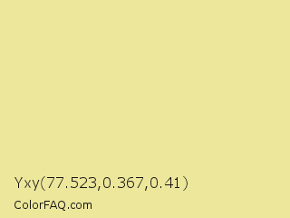 Yxy 77.523,0.367,0.41 Color is a light yellow color and the nearest color is Primrose #edea99. Hex code #ede79b and RGB value is rgb(237,231,155). In RGB color space, this color is composed of 93% red, 91% green, 61% blue, In CMYK color space, this color is composed of 0% cyan, 3% magenta, 35% yellow , 7% black , In HSL color space, this color has a hue angle of 56° , 69% saturation and 77% lightness.