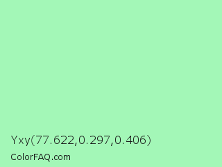 Yxy 77.622,0.297,0.406 Color is a light green color and the nearest color is Teal Deer #99e6b3. Hex code #a3f7b7 and RGB value is rgb(163,247,183). In RGB color space, this color is composed of 64% red, 97% green, 72% blue, In CMYK color space, this color is composed of 34% cyan, 0% magenta, 26% yellow , 3% black , In HSL color space, this color has a hue angle of 134° , 84% saturation and 80% lightness.