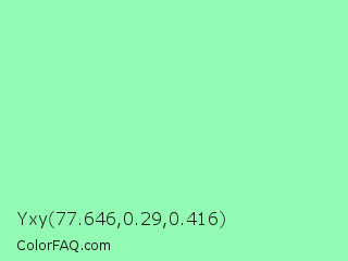 Yxy 77.646,0.29,0.416 Color is a light green color and the nearest color is Teal Deer #99e6b3. Hex code #92fab3 and RGB value is rgb(146,250,179). In RGB color space, this color is composed of 57% red, 98% green, 70% blue, In CMYK color space, this color is composed of 42% cyan, 0% magenta, 28% yellow , 2% black , In HSL color space, this color has a hue angle of 139° , 91% saturation and 78% lightness.