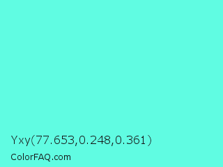 Yxy 77.653,0.248,0.361 Color is a light cyan color and the nearest color is Aquamarine #7fffd4. Hex code #60fce2 and RGB value is rgb(96,252,226). In RGB color space, this color is composed of 38% red, 99% green, 89% blue, In CMYK color space, this color is composed of 62% cyan, 0% magenta, 10% yellow , 1% black , In HSL color space, this color has a hue angle of 170° , 96% saturation and 68% lightness.