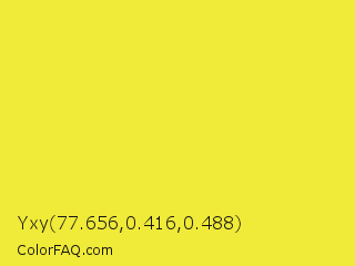 Yxy 77.656,0.416,0.488 Color is a normal yellow color and the nearest color is Dandelion #f0e130. Hex code #f0ea38 and RGB value is rgb(240,234,56). In RGB color space, this color is composed of 94% red, 92% green, 22% blue, In CMYK color space, this color is composed of 0% cyan, 3% magenta, 77% yellow , 6% black , In HSL color space, this color has a hue angle of 58° , 86% saturation and 58% lightness.
