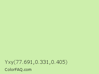 Yxy 77.691,0.331,0.405 Color is a very light green color and the nearest color is Gossip #d2f8b0. Hex code #cdefac and RGB value is rgb(205,239,172). In RGB color space, this color is composed of 80% red, 94% green, 67% blue, In CMYK color space, this color is composed of 14% cyan, 0% magenta, 28% yellow , 6% black , In HSL color space, this color has a hue angle of 90° , 68% saturation and 81% lightness.