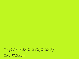 Yxy 77.702,0.376,0.532 Color is a normal lime color and the nearest color is Arctic Lime #d0ff14. Hex code #bff720 and RGB value is rgb(191,247,32). In RGB color space, this color is composed of 75% red, 97% green, 13% blue, In CMYK color space, this color is composed of 23% cyan, 0% magenta, 87% yellow , 3% black , In HSL color space, this color has a hue angle of 76° , 93% saturation and 55% lightness.