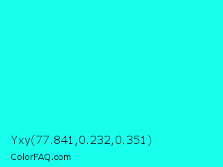 Yxy 77.841,0.232,0.351 Color is a normal cyan color and the nearest color is Loeen #15f2fd. Hex code #19ffed and RGB value is rgb(25,255,237). In RGB color space, this color is composed of 10% red, 100% green, 93% blue, In CMYK color space, this color is composed of 90% cyan, 0% magenta, 7% yellow , 0% black , In HSL color space, this color has a hue angle of 175° , 100% saturation and 55% lightness.